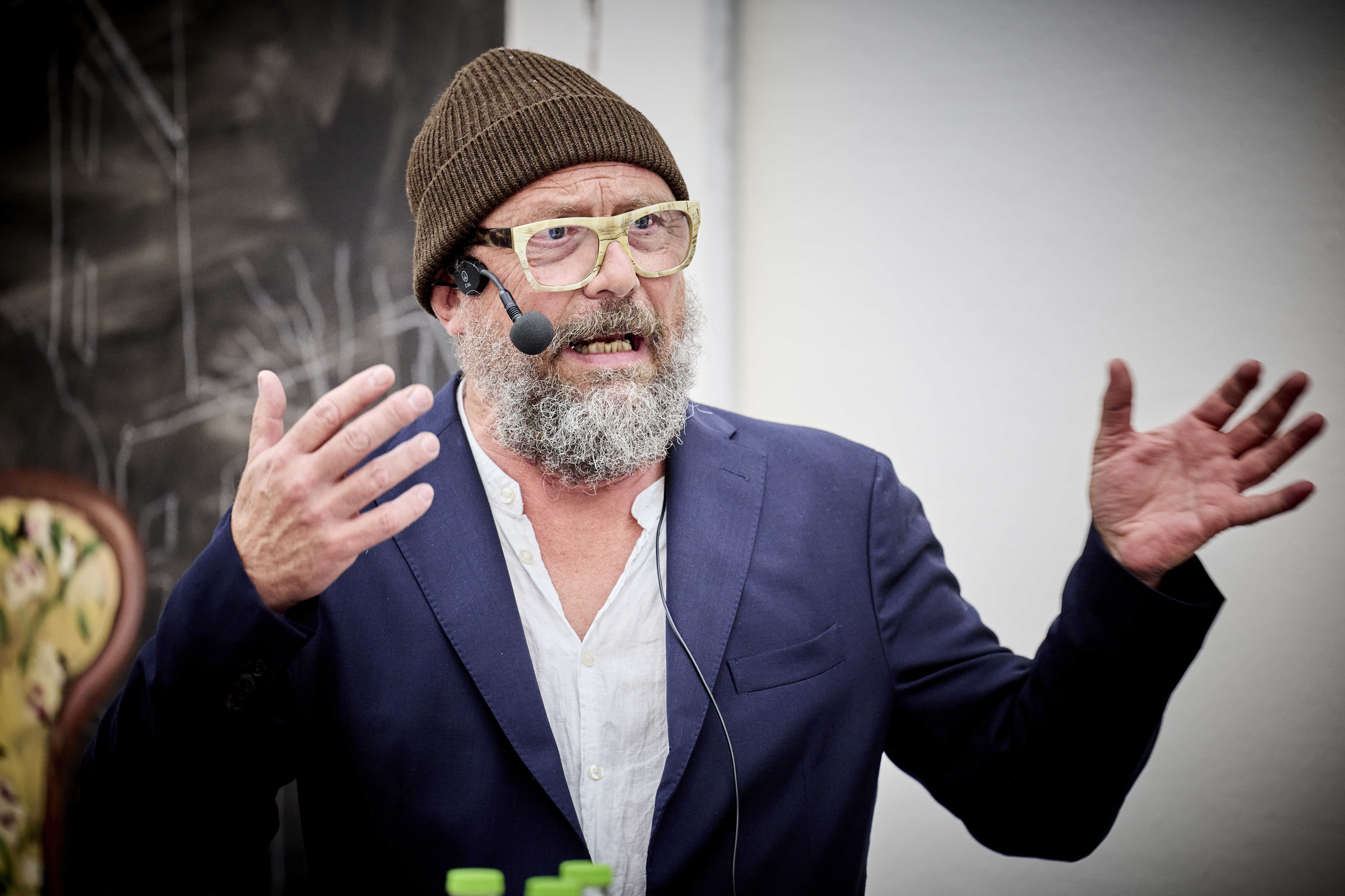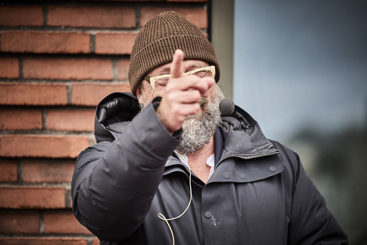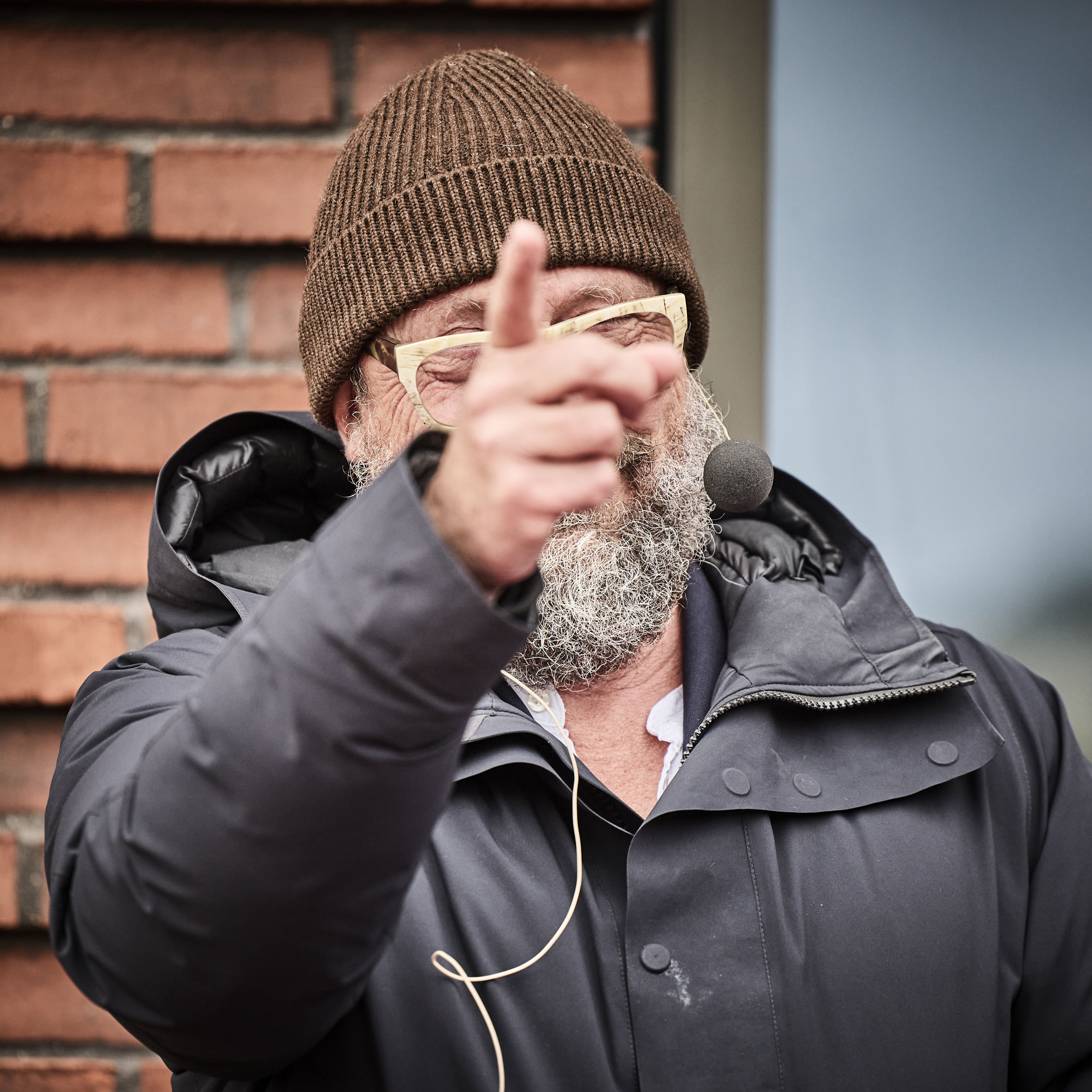 Skulpturen forestiller en kappeklædt mand, der er væltet ned af en alt for lille sokkel. Figurens ansigt er forenklet og kan ikke identificeres. Skulpturen kan således på humoristisk vis forestille hvem som helst og dermed os alle. Skulpturen afspejler den statuedebat, der opleves verden over, hvor demonstranter vælter eller modificerer fortidens statuer over magtfulde personer. Med skulpturens fald ønsker Frandsen at skabe rum for samtale og fri demokratisk debat.