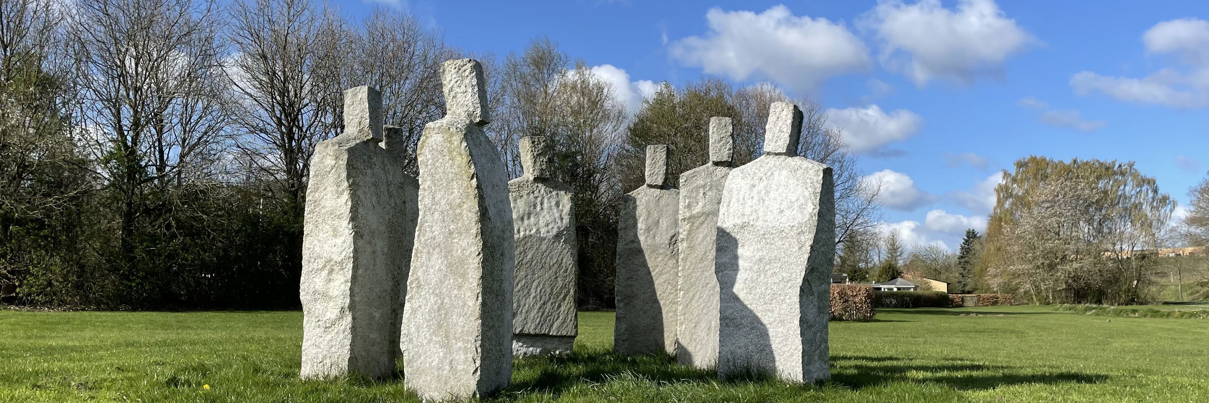 This sculpture depicts seven monumental human figures. The granite is hewn in a rough manner, and the ’citizens’ have both their legs planted firmly into the soil. Perhaps an image of the citizens of Langå.