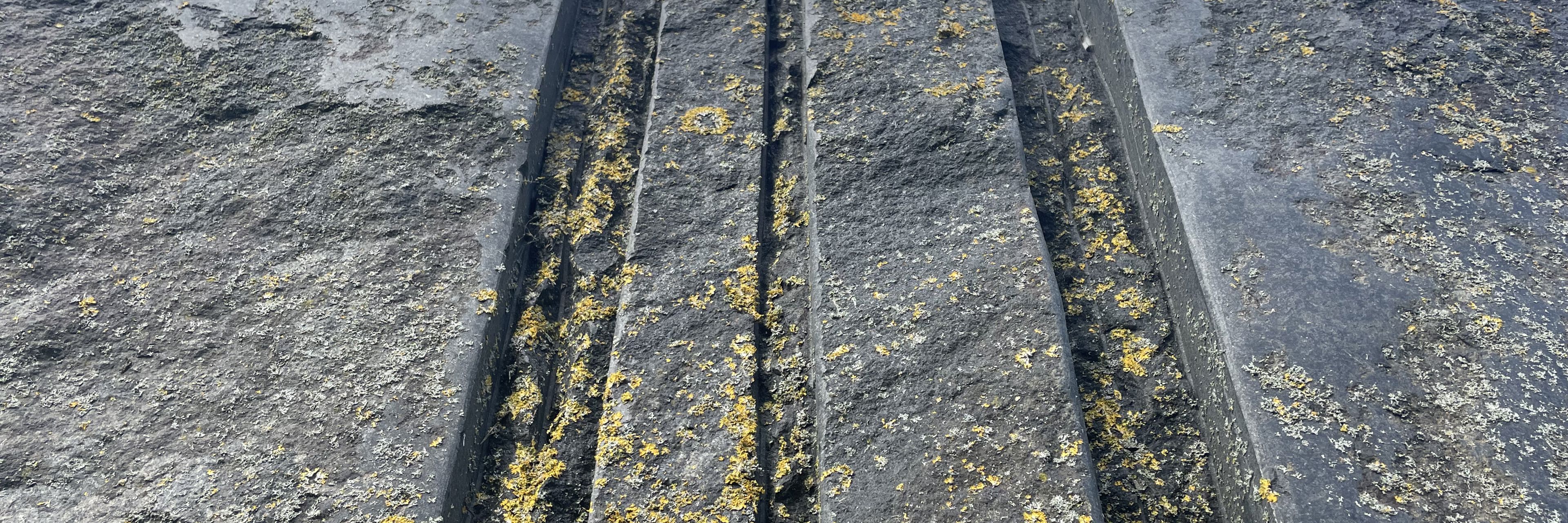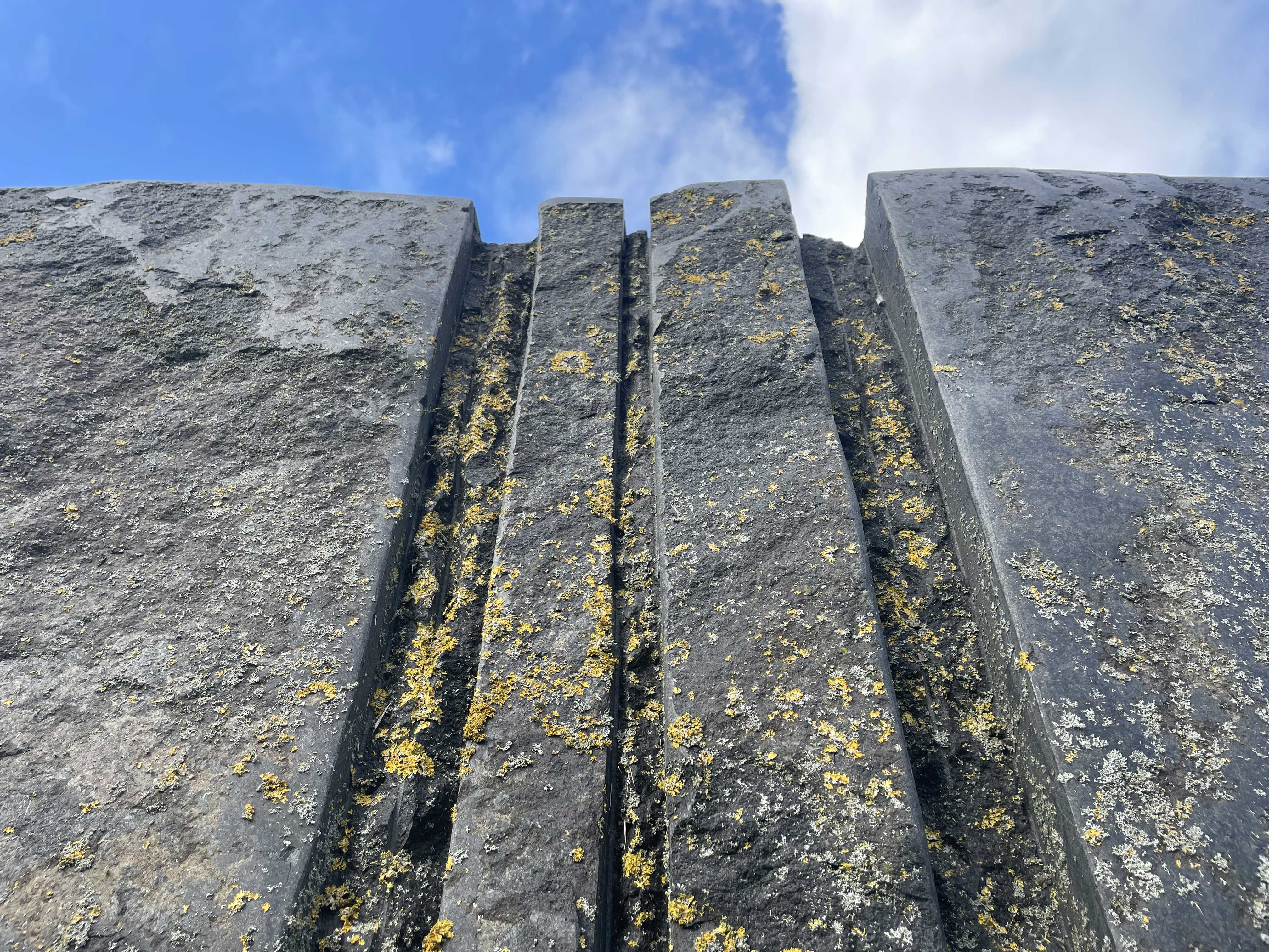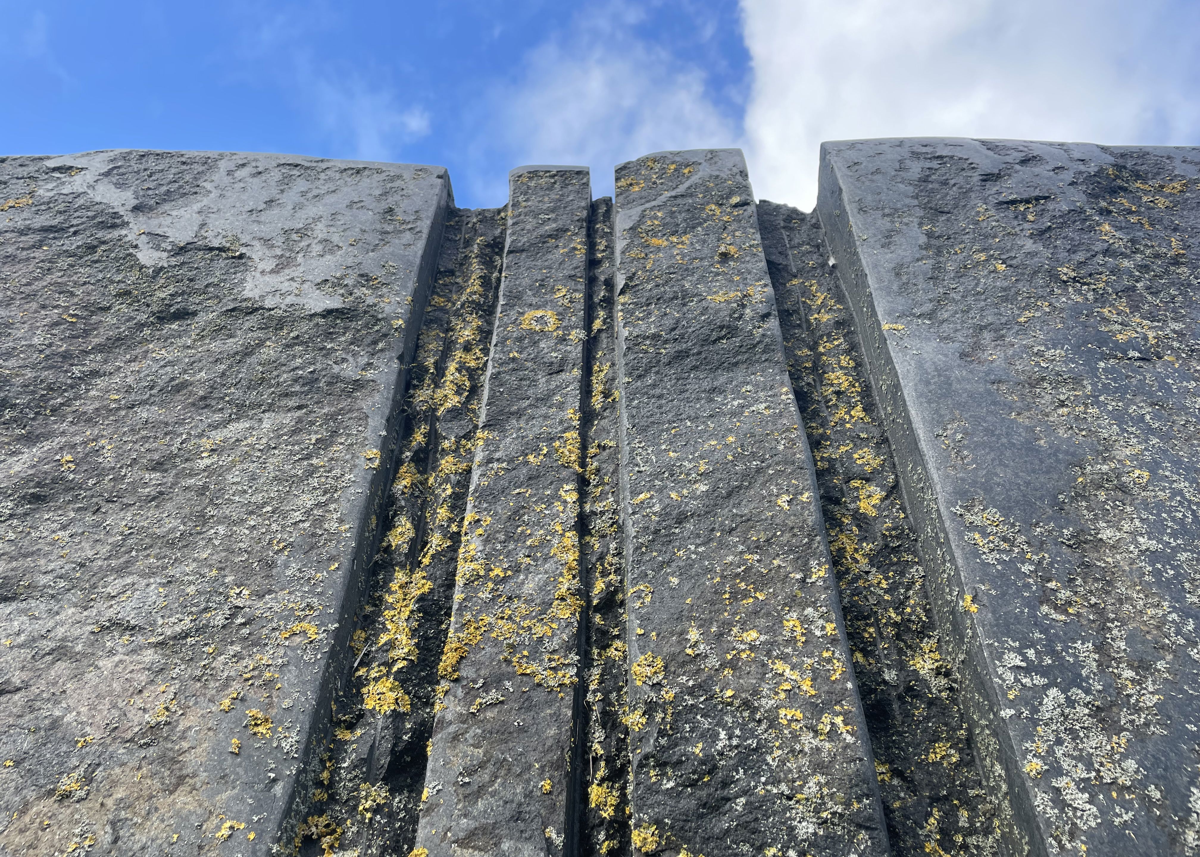 Skulpturens grove, stoflige overflade gennemskæres af et skråt snit fra top til bund og vidner om kunstnerens fascination af lys- og skyggevirkninger.