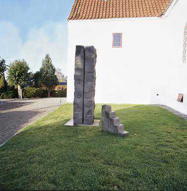 The sculpture consists of a small flight of stairs and a larger block of granite. The granite block is divided by a narrow passage of air, forming a cross. The stairs can be seen as a Jacob’s Ladder, a symbol from Moses 1. In the night, Jacob dreams of a ladder reaching into heaven. At the end of the ladder, Jacob sees God. In that sense, the Jacob’s Ladder symbolises the connection between heaven and earth.