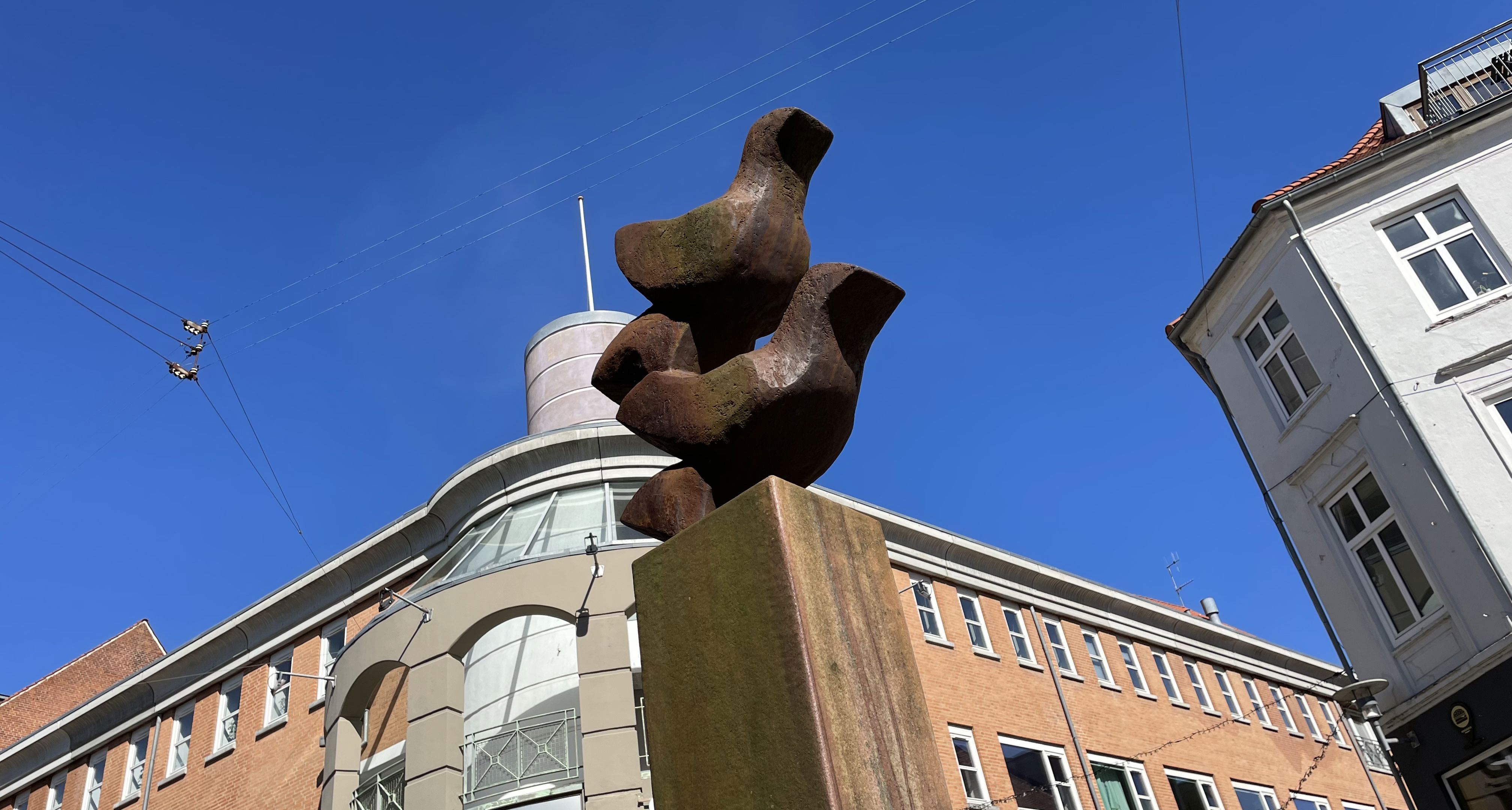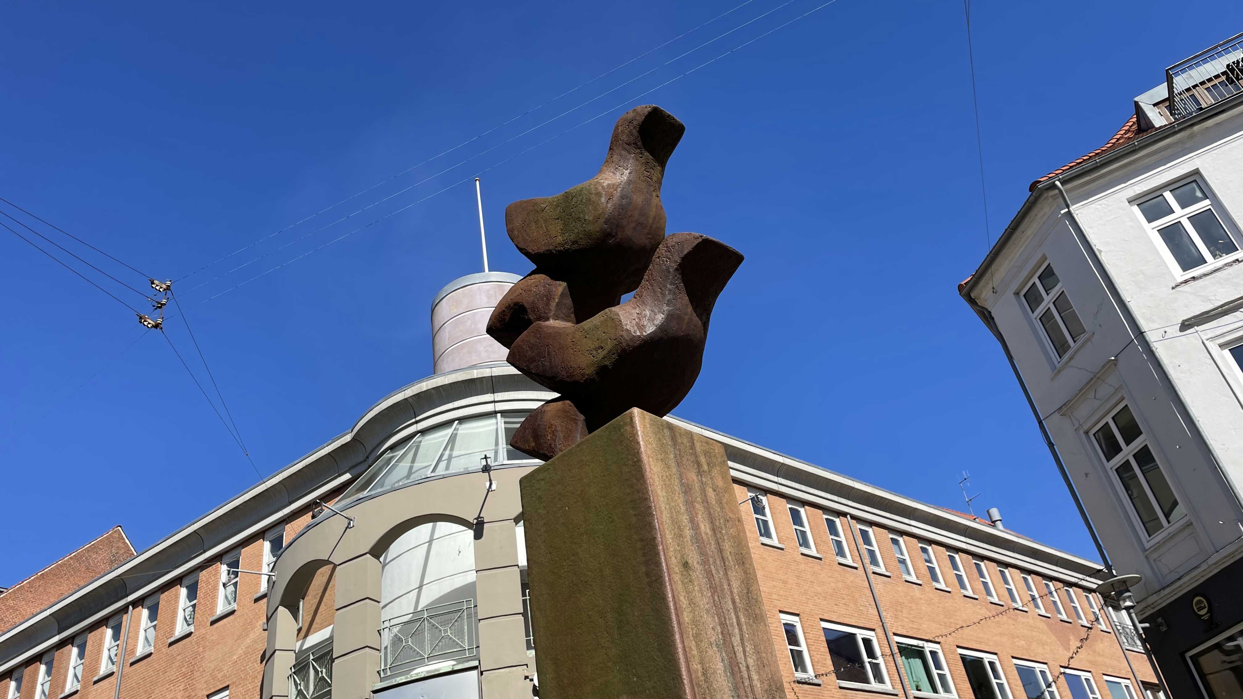Erik Heides to fugle i granit, der er ved at lette fra jorden, er kendetegnet ved et forenklet formsprog. Alle naturalistiske detaljer er renset væk til fordel for en betagelse af urformen fugl og af figurernes opdrift.