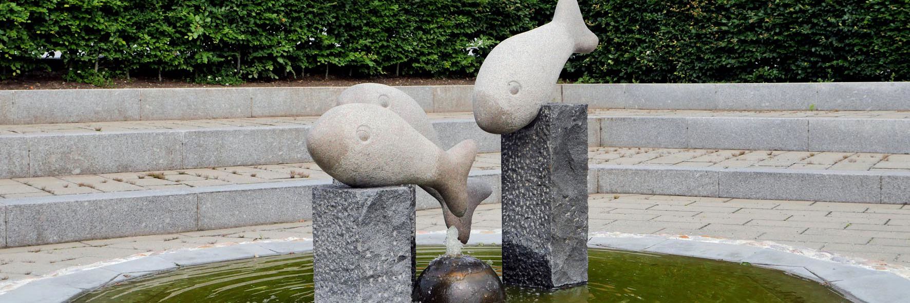 This little piece of water art in Langå Square is carved in granite. The sky and the surroundings are reflected in the water, which is the playground of three fat fish – animals widely represented in Langå, where the Gudenå river flows by.