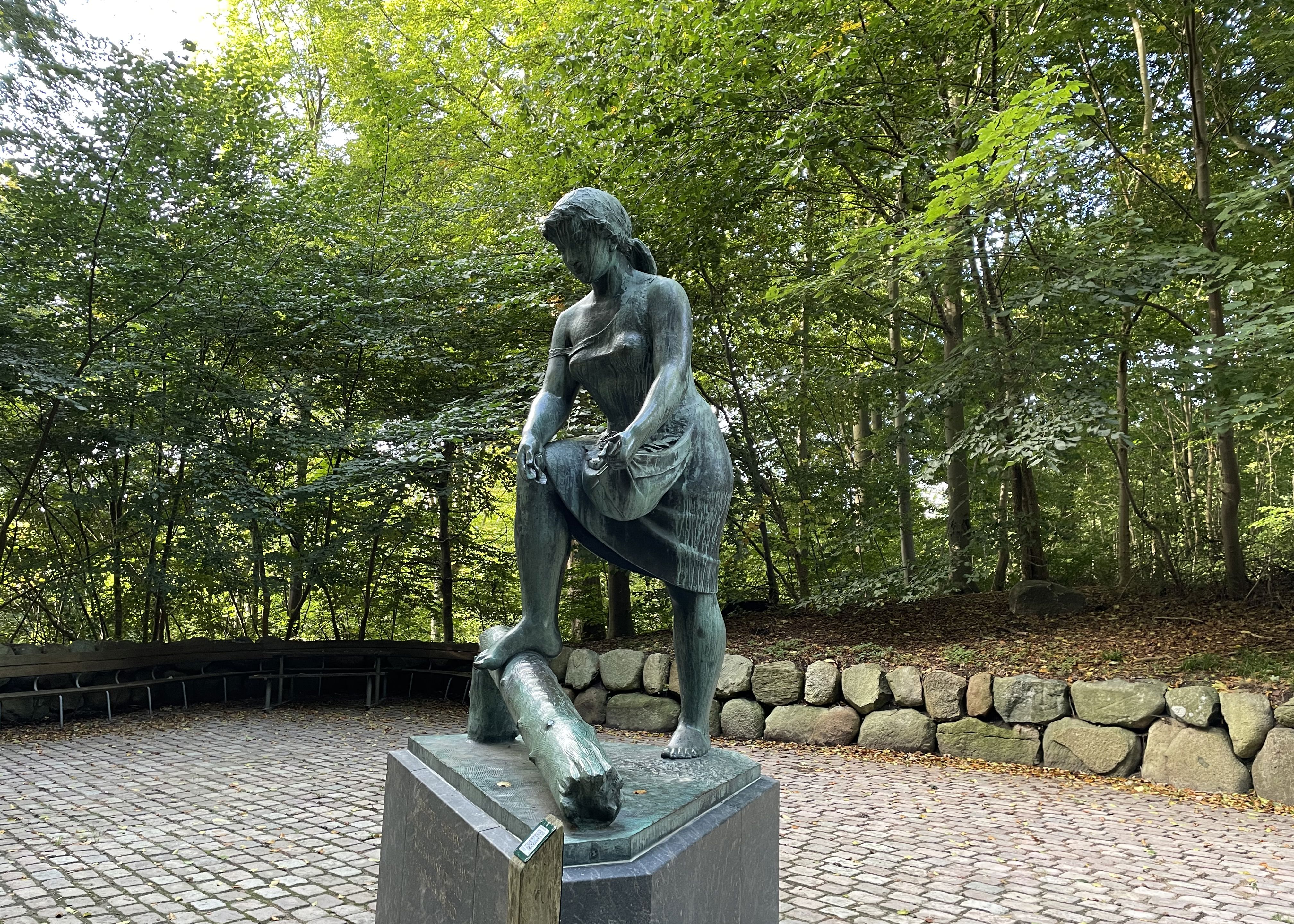 The young woman is standing with her foot on a broken stake, which is used to tie people up for torture. The woman is strewing flowers on the ground, where resistance fighters were killed. The monument is a commemoration of the losses suffered by the resistance during World War II. The surrounding area was laid out by architect Arne Jacobsen.