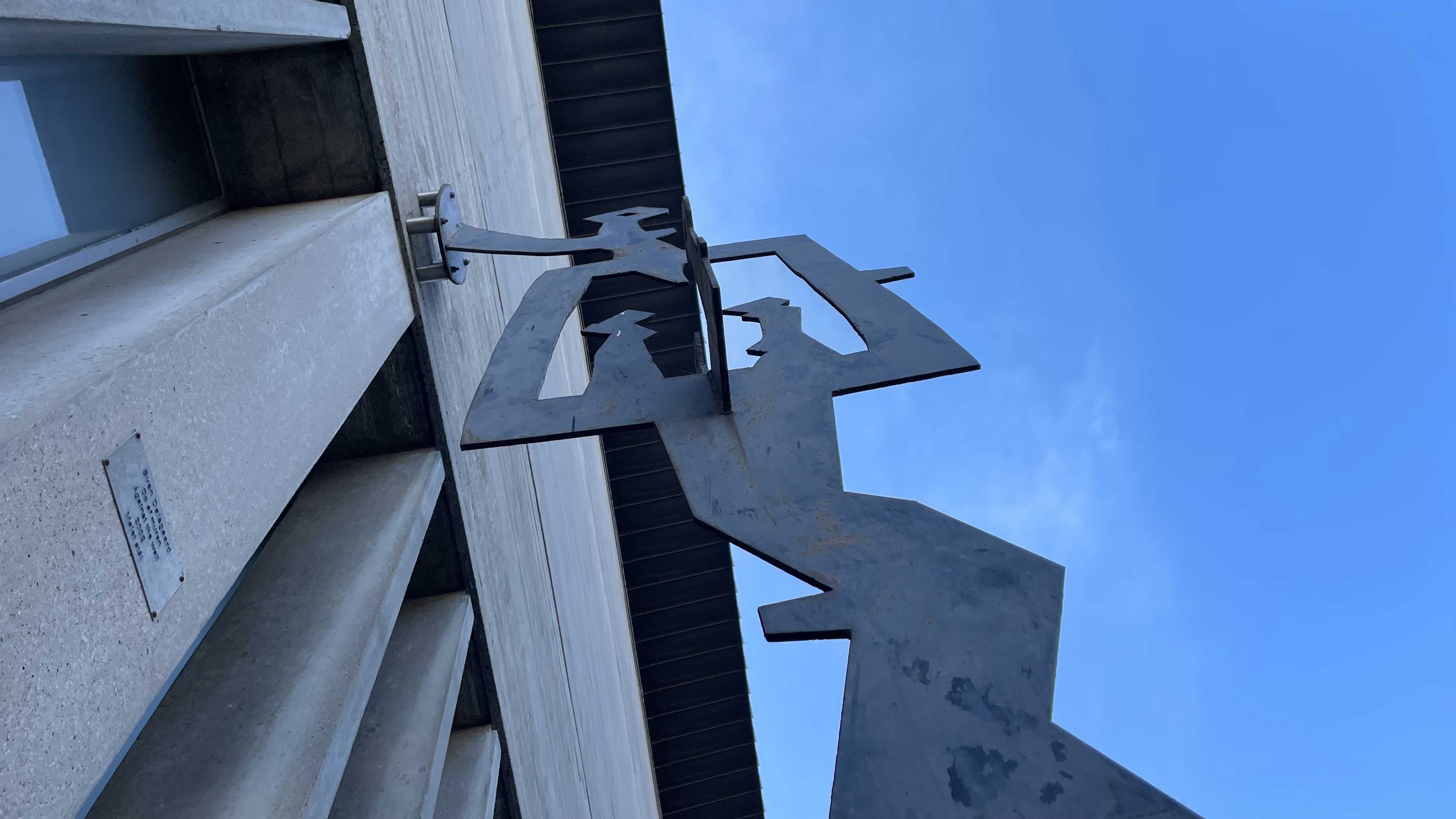 En finurlig, flad skulptur, der trods sin abstrakte fremtoning alligevel minder meget om et menneske: En tydeligt kønsbestemt mandsperson, der læner sig (måske ligefrem lader sit vand?!) op ad muren.