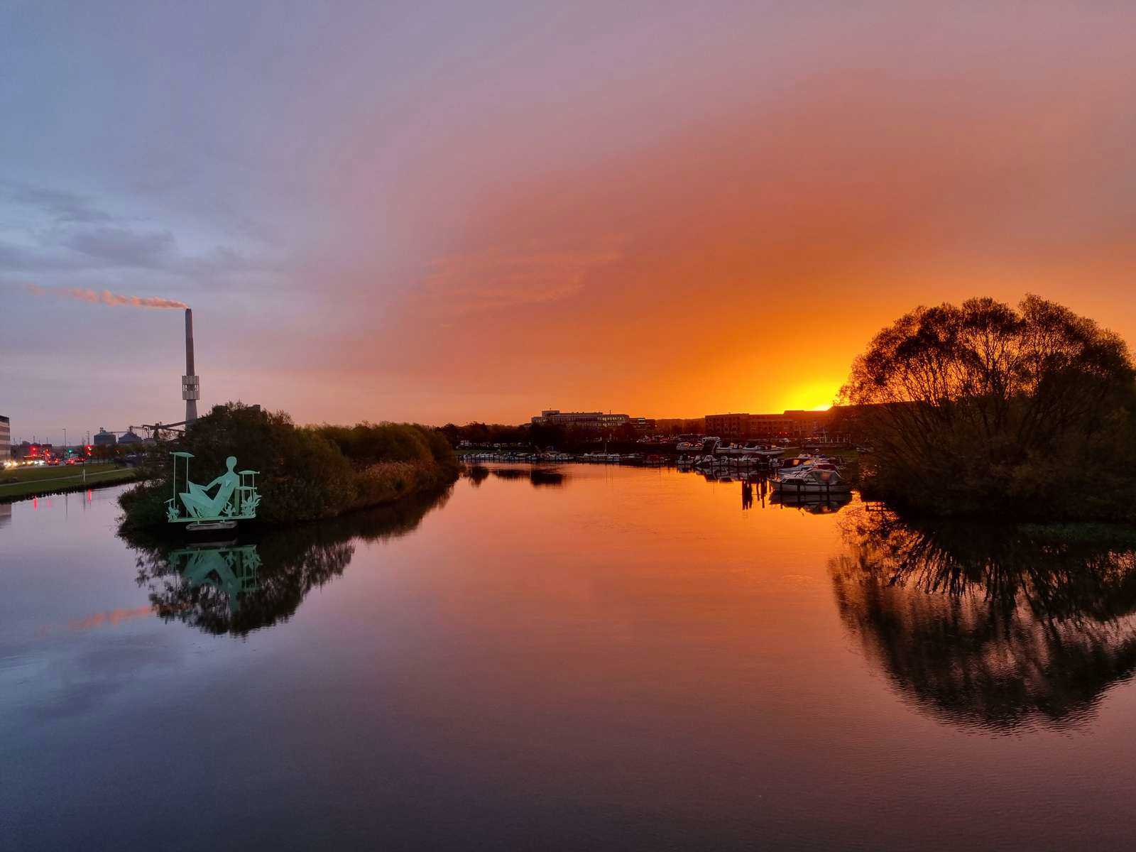 På øen skuer 'Pigen i Gudenåen' nu ud over Gudenåen og Vorup Enge, mens byens trafikårer langs Tørvebryggen og Randers Bro leverer en daglig summen af effektive mennesker og sivene sammen med insekterne på den anden side leverer en stille naturlig susen.