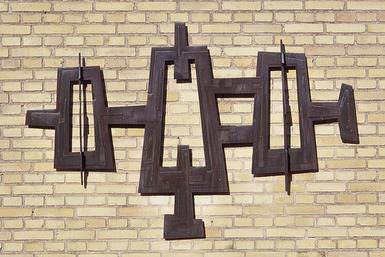 The simple, nonfigurative expression of the relief, consists of geometric figures and narrow lines. The relief is similar to Dalgaard’s work from the 50s, which consisted of simple, combined geometric modules. In spite of the abstract character of the relief, it evokes associations to machines, metalwork and handicrafts, with its holes, wooden fittings and screw-like forms, and not least due to the placement near the technical college.