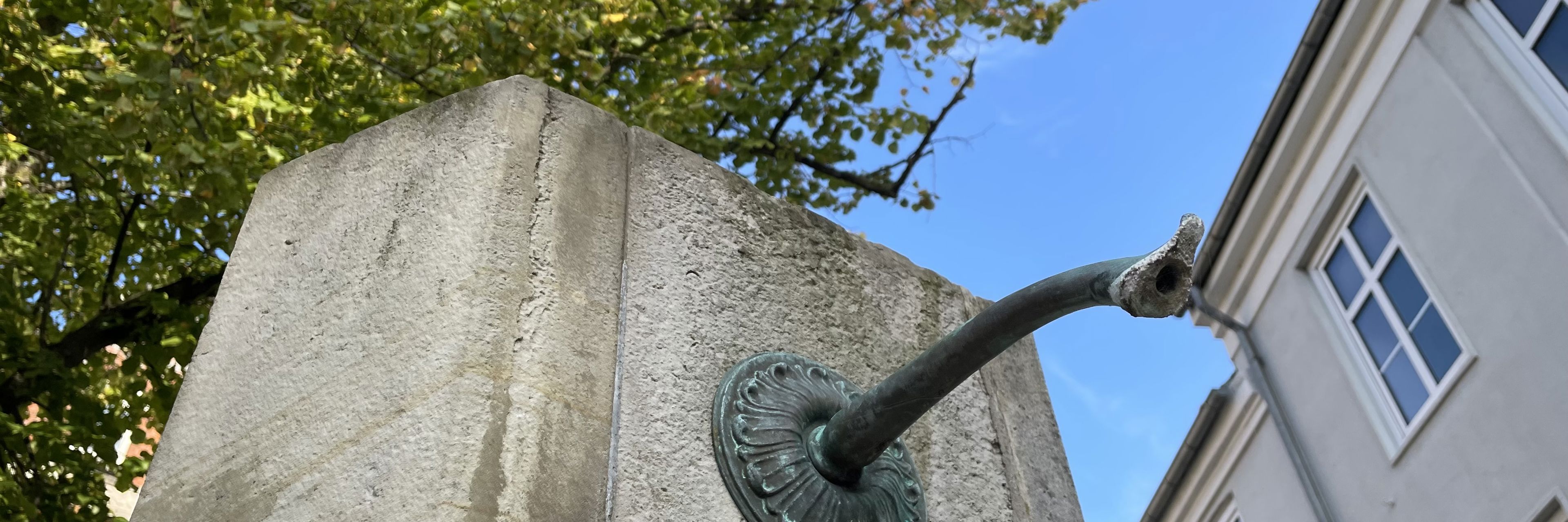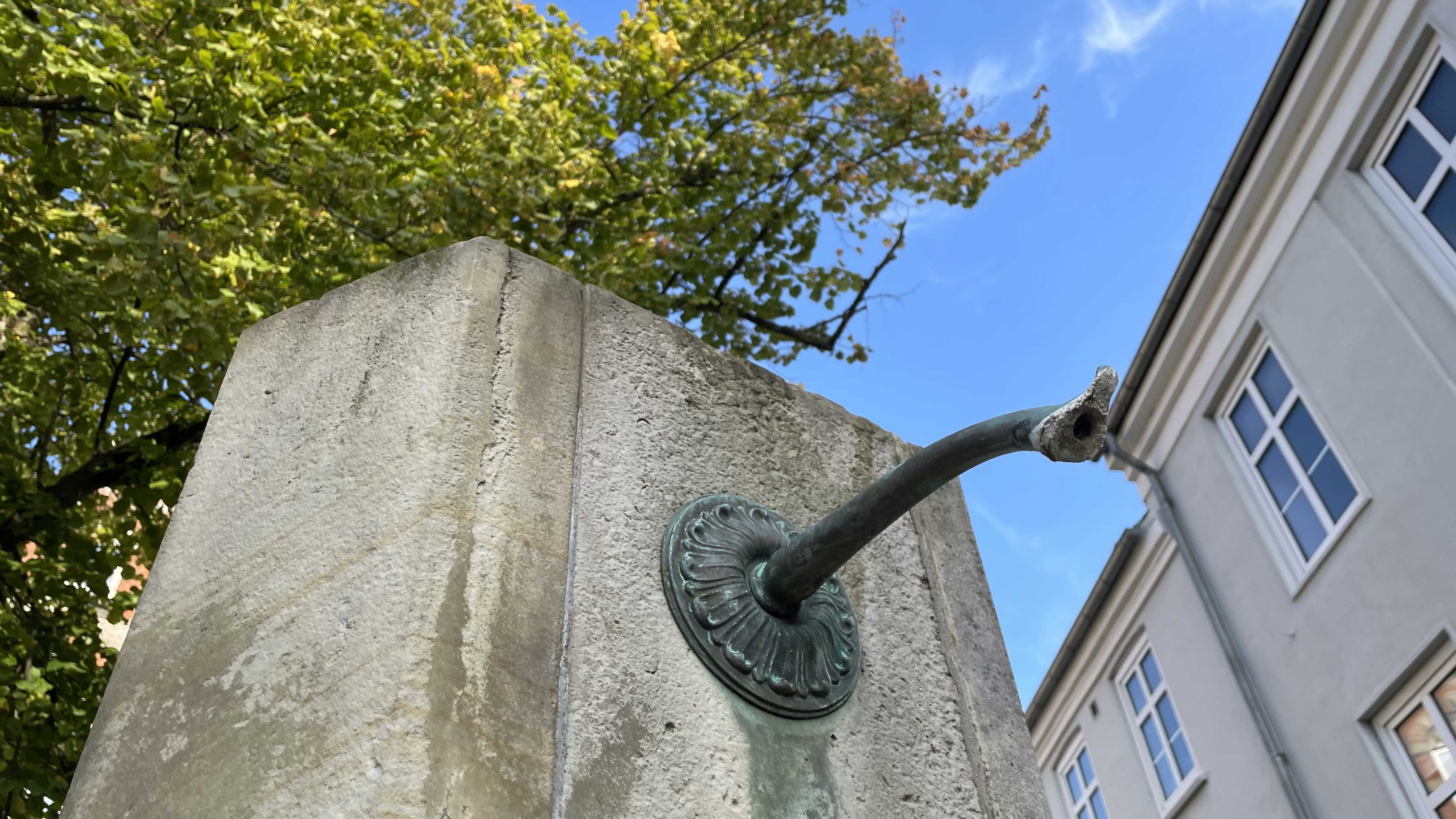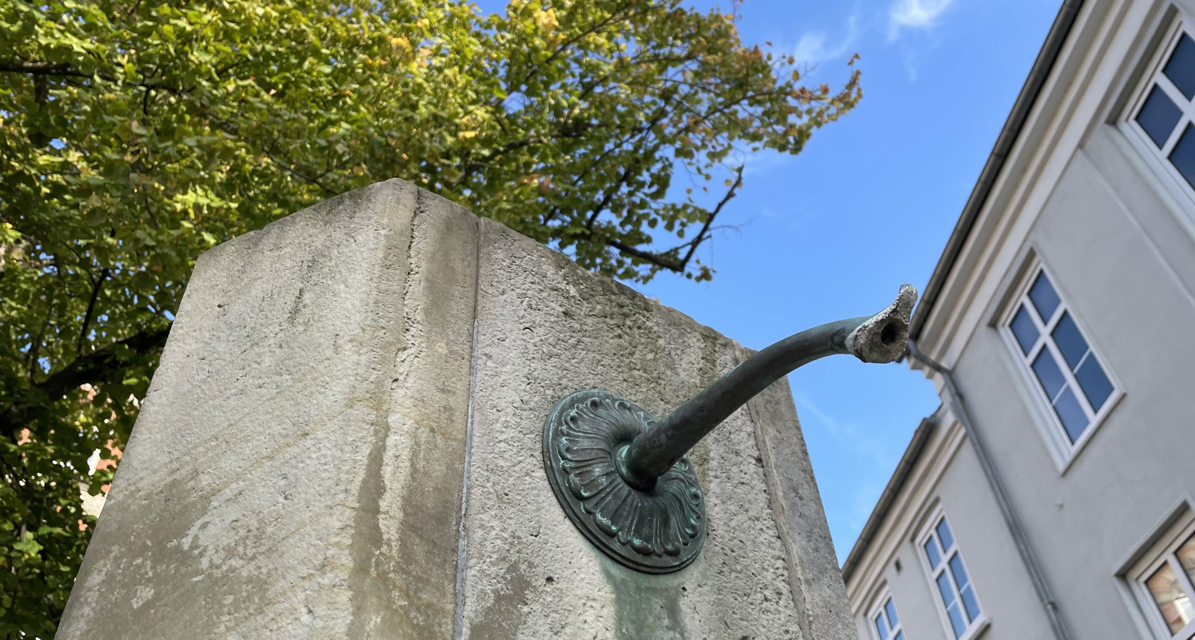 The triangular well is built where the cemetery for the poor people of the city used to be, along with the adjoining small Catholic church. The church was dedicated to the patron saint of the poor, St. Lawrence. An inscription on the well explains that "Sct. Laurentii Taarer" (the tears of St. Lawrence) flow from it.