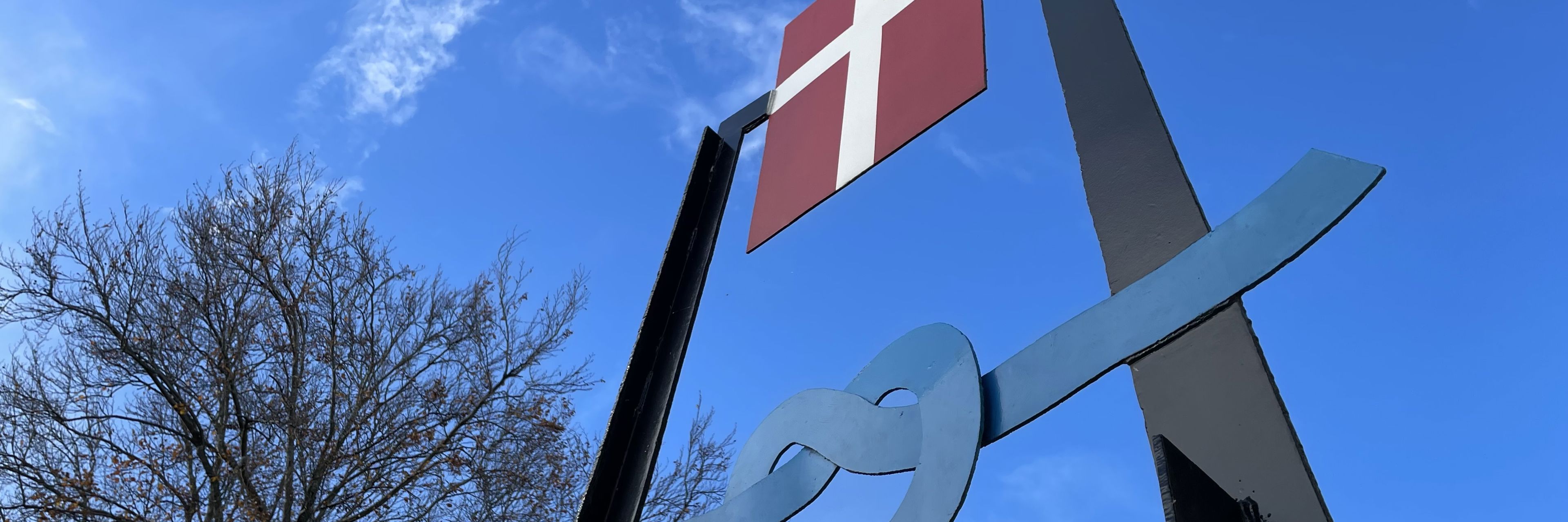 The metal sculpture with the Danish flag forms a small gate opening, partially sealed off by a blue